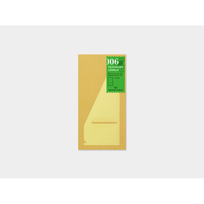 The 006. Pocket Sticker LargeRefill TRAVELERS notebook features one large adhesive that you can stick onto the inside (or outside) of the TRAVELERS notebook cover. It is large enough to hold an A4-page folded in three and also features a small slot to hold business cards or key cards.