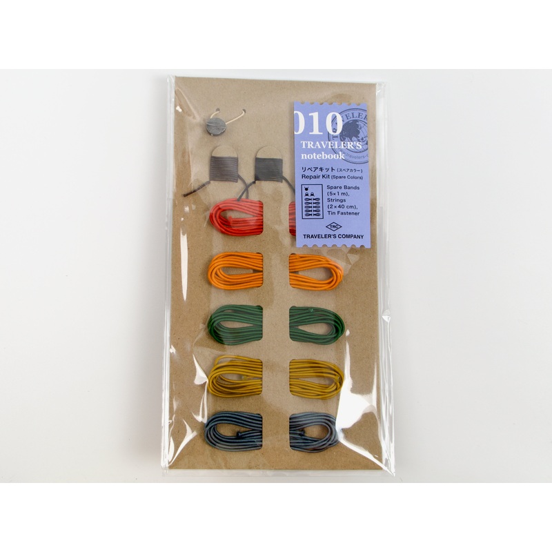 The Repair Kit is now available with five spare colors. It comes with a tin charm, 5 sets of bands, and 2 strings to use as bookmarks. If the band on your TRAVELERS notebook gets cut or loosened, please use this to repair. TRAVELERS notebook is simple to f