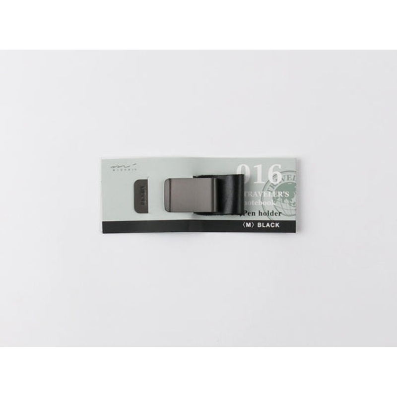 The 016. Penholder (M)Black TRAVELER’S notebook is a clip type holder, featuringa leather strap that holds the barrel of your pen, and a gunmetal clip that attaches to your TRAVELER’S notebook cover. For this size, pens up to a diameter of 12mm can be inserted to the holder.