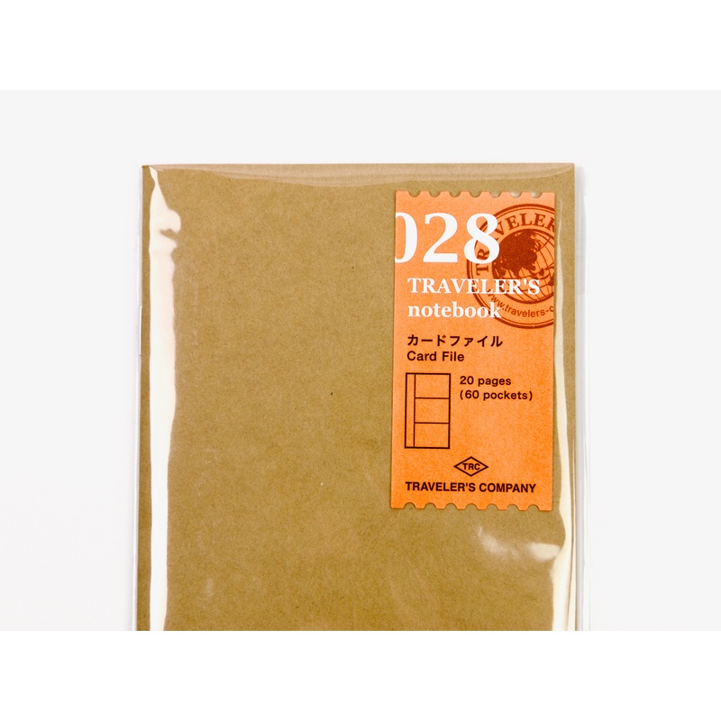 The Traveler's Company 028 Card Fileholds up to 60 cards or card size items (such as small sticker sheets or photos). There are 20 pages with 3 pockets on each page. You can write on the transparent card pockets with an oil-based marker.For California Cons