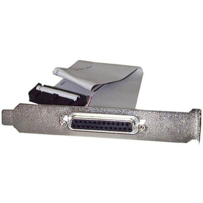 The PLATE25F16LP DB25 to IDC26 Parallel Port Bracket adds a DB25 parallel port to the rear panel of a low profile/small form factor computer, which connects to an IDC26 header connector on the motherboard.