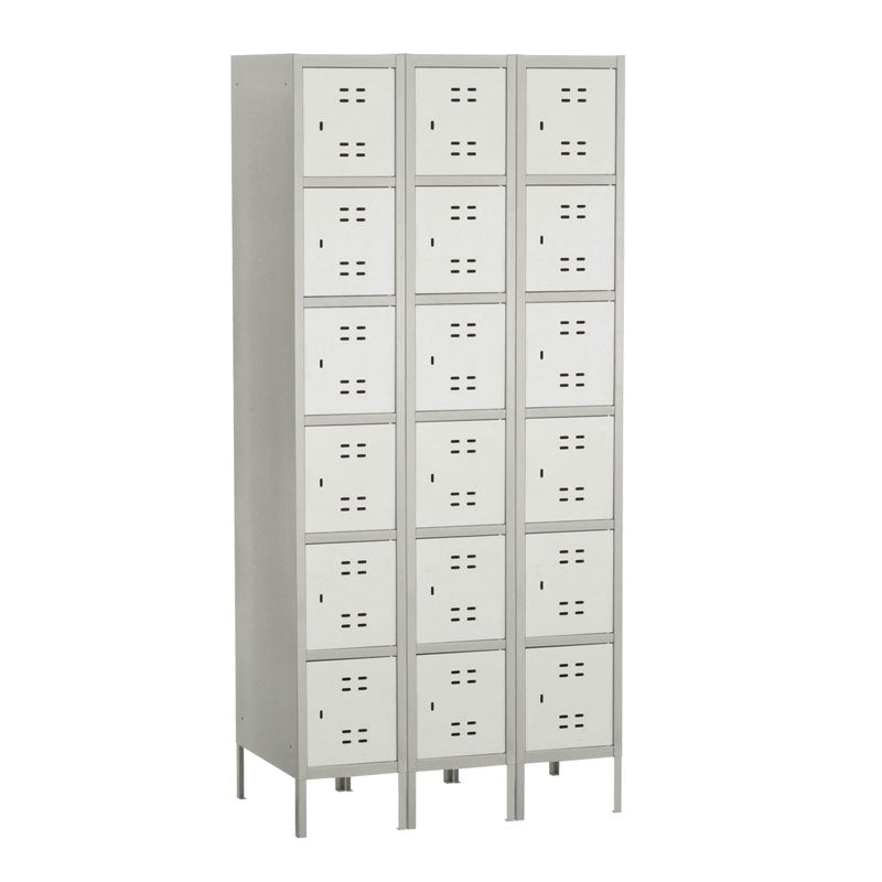 Lock it up with style! These contemporary two tone lockers will fit into any environment. Choose from a single, double or six tier compartment. Strong, one piece uni-body design boasts a heavy gauge all steel construction so it can stand up to tough conditions in any environment where extra, secure storage is needed. Box units include hasps. Units can be used as stand alone or can be linked together. Users provide their own padlock for maximum security. Choose from a two tone gray or two tone tan color. Lockers come fully assembled.