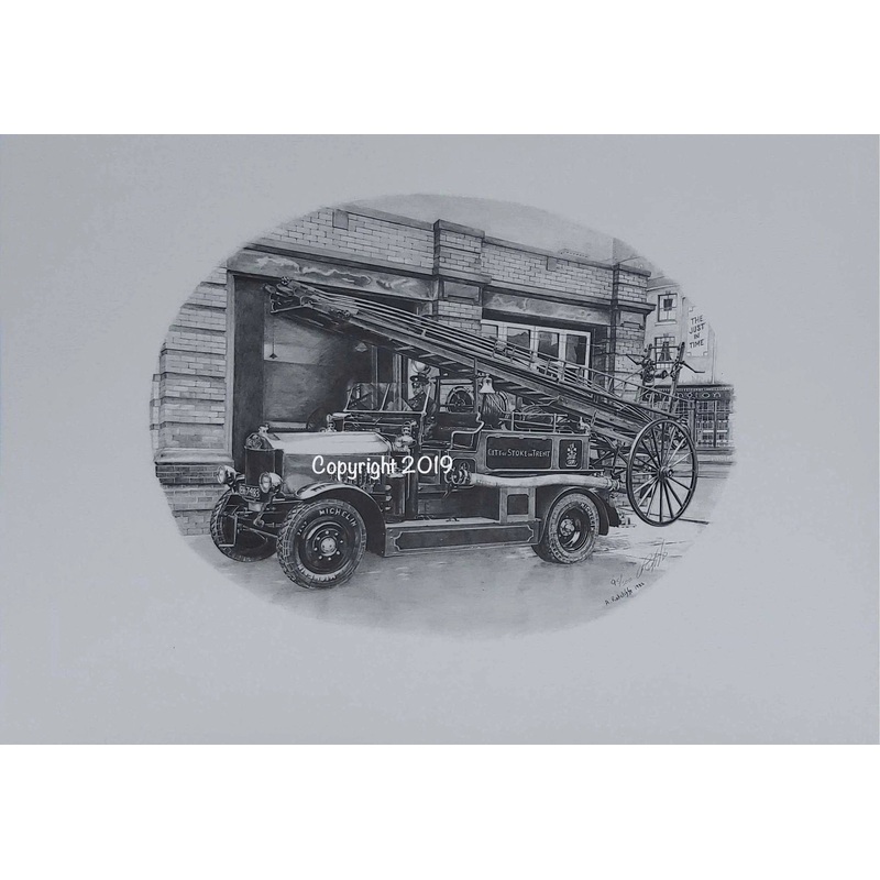 This is a print of a pencil drawing taken form an original photograph. The original image was shot circa 1928 outside Hanley Fire station in Old Hall street Stoke on Trent.