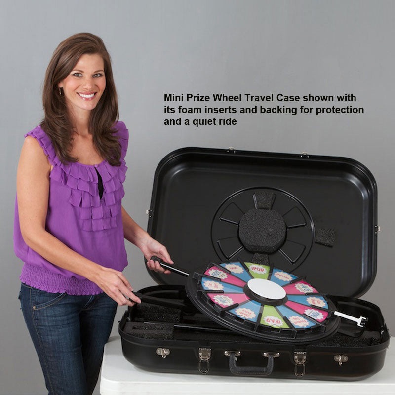 Protect and transport Mini Prize Wheel easily.Once you have one, you’ll find that a Prize Wheel has so many different and creative applications, you’ll have to take it on the road. Our Mini Prize Wheel Travel Case protects your Prize Wheel and makes transportation easy. The hard-shell design protects the Wheel from sharp corners and punctures, while the soft foam inserts securely suspend the Wheel in the center of the case. Features heavy-duty hinges, four latches, comfortable carry handle, and detachable shoulder strap.