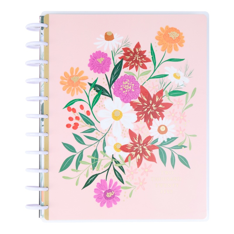 Fill your life with flowers with this Blooming Bouquet Happy Planner. Use the checklist layout to keep everything organized from to-dos to daily reminders. This Big size floral planner will give you plenty of room to plan it all. The weekly spreads run from January 2025-December 2025. 12 dividers feature warm colors and floral designs to remind you of a quiet day in the garden.