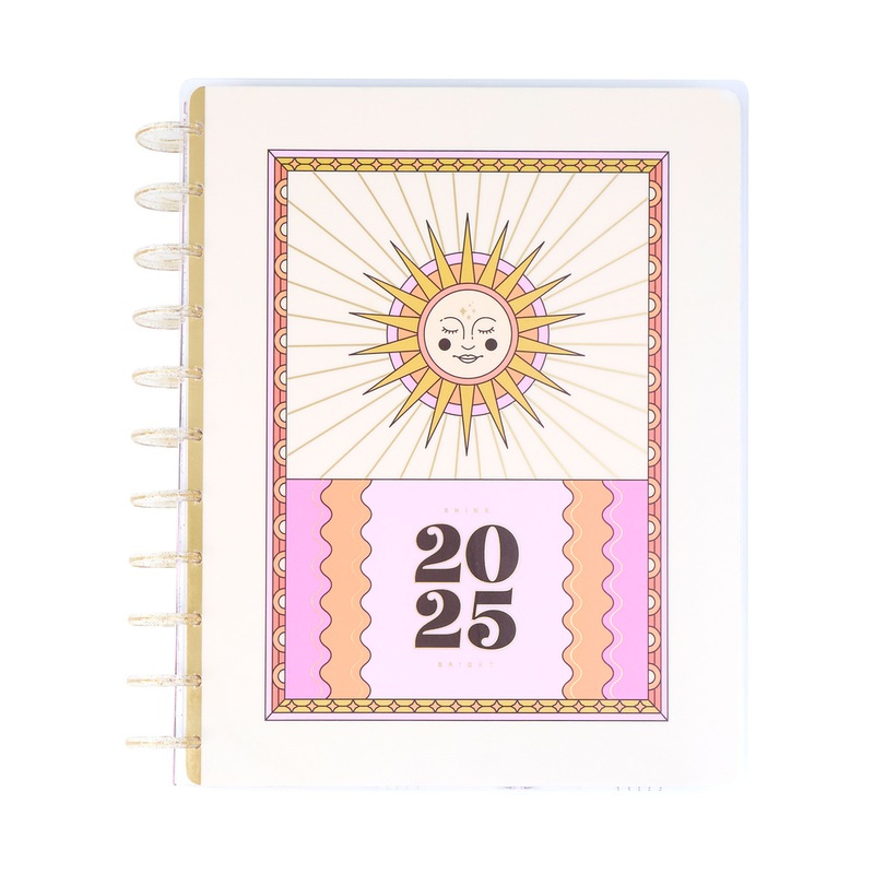 See the good with this Desert Mystic Happy Planner. This Big size vertical planner runs from January 2025-December 2025 and features stylized suns, moons, and new-age designs. Organize your next year with warm colors and 12 unique dividers with inspirational messagesin this desert celestial planner. Add accessories and stickers and completely customize your planner.