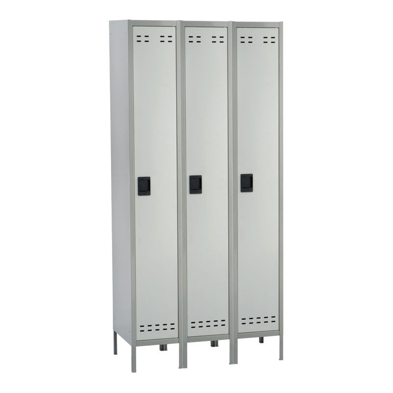Lock it up with style! These contemporary two tone lockers will fit into any environment. Choose from a single, double or six tier compartment. Strong, one piece uni-body design boasts a heavy gauge all steel construction so it can stand up to tough conditions in any environment where extra, secure storage is needed. Units can be used as stand alone or can be linked together. Recessed handle with padlock provision has no protruding parts and includes a 2 point locking mechanism for complete security. Users provide their own padlock for maximum security. Single Tier has Hat Shelf w/ coat hooks as well as adjustable hooks for coat rods. Choose from a two tone gray or two tone tan color. Lockers come fully assembled.