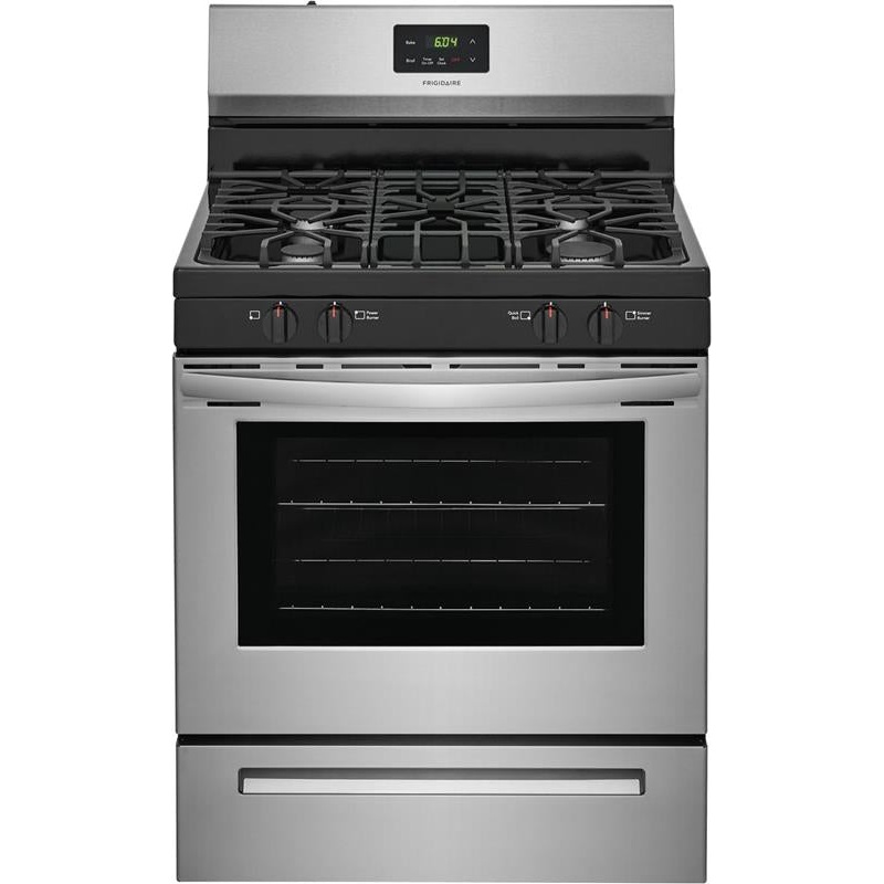 The Frigidaire 30" Gas Range gives you more cooking flexibility with a 5.0 cu. ft. capacity oven and storage drawer. The cooktop features four sealed gas burners with continuous grates, including a 16,000 BTU quick boil burner and a low-simmer burner, so y