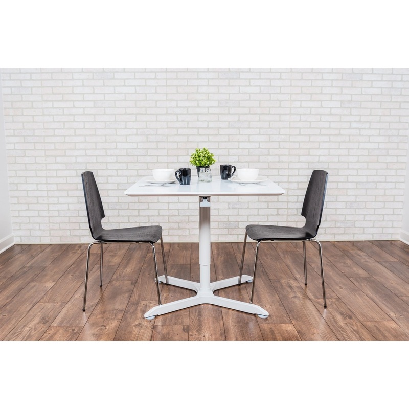 FeaturesPerfect for offices, restaurants, cafeterias, schools, trade shows, and other venuesPneumatic air cylinder provides effortless height adjustment in seconds36 square white tabletop with contoured edgesDurable steel base and MDF top with polyurethane