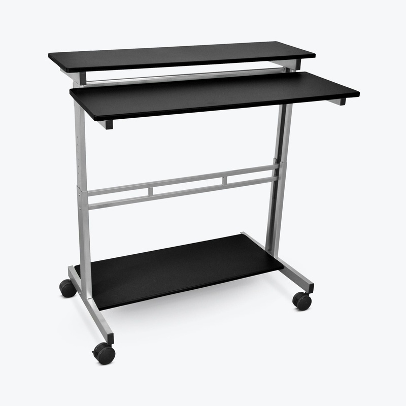FeaturesHeight of lower and upper shelves adjust simultaneously in 1" incrementsMobile and adjustable for comfort and productivityTwo-tiered shelf design with double laminate wood surfaceAvailable in black or dark walnut color optionsDurable steel frame wi