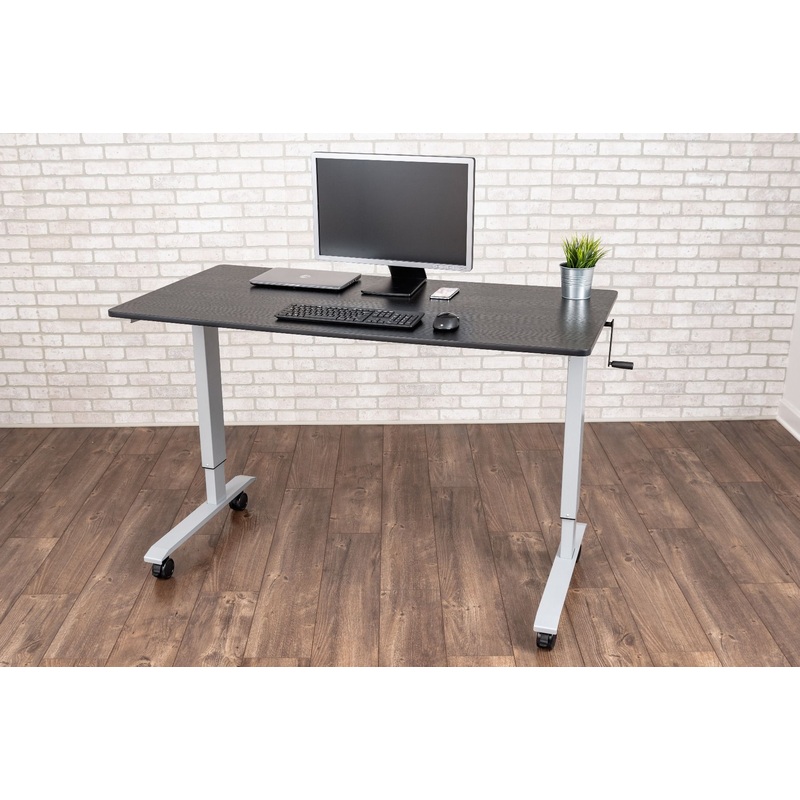 FeaturesHigh speed crank allows for rapid adjustment from sitting to standingCrank handle quickly raises the desk height between 32.6 and 48.5 (with casters)Crank handle quickly raises the desk height between 29.6 and 45.5 (with glides)Spacious 59 x 29.5 d