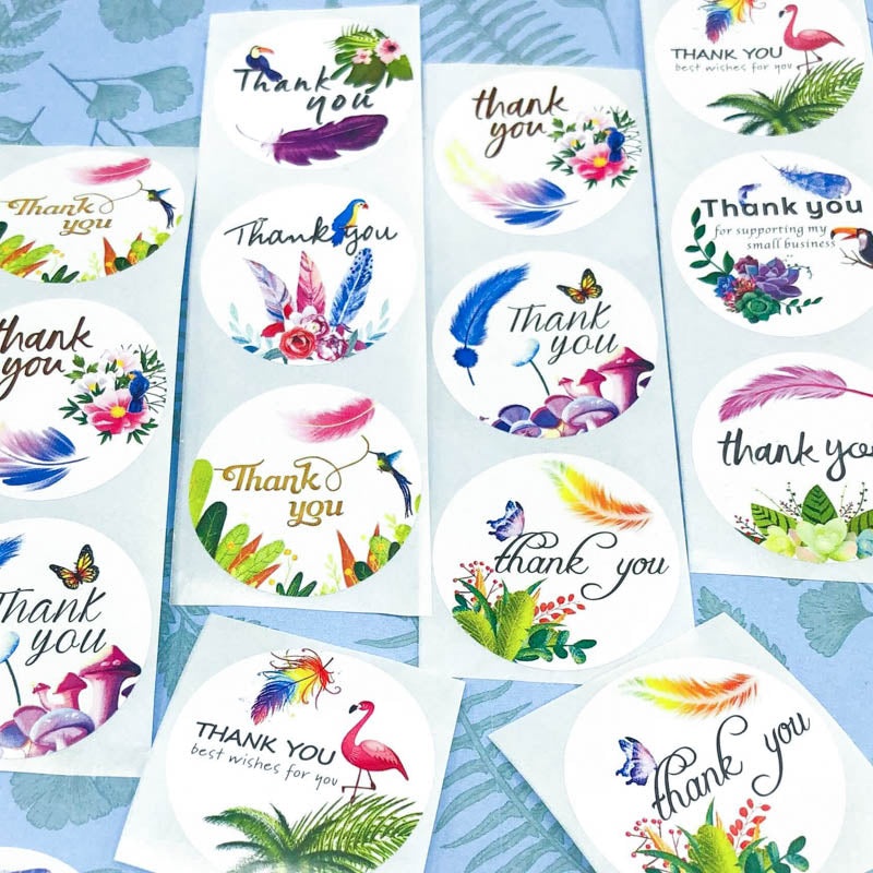 You will receive a set of 10 large, glossy thank you stickers each 38mm in diameter. Designs include flowers, feathers, birds and butterflies. Choose which option you would like from the drop down menu. Each large sticker comes on its own separate little s