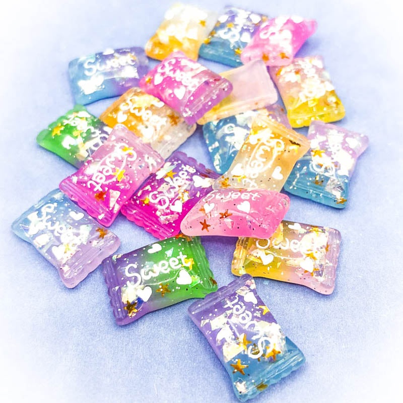 Each sweet glitter resin flatback measures 16mm long. You will receive one lucky dip candy flat back or can opt for a pair in the same colour or a mixed set of 4. They have hearts and stars pattern and flecks of gold as well as glitter inside.
