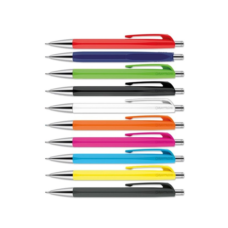The Caran d'Ache 888 Infinite ballpoint is offered in a range of bright, vibrant colors. The hexagonal barrel is synthetic resin while the retract mechanism and front section are metal. Sizeable plastic pocket clip. Blue SwissRide ink cartridge.