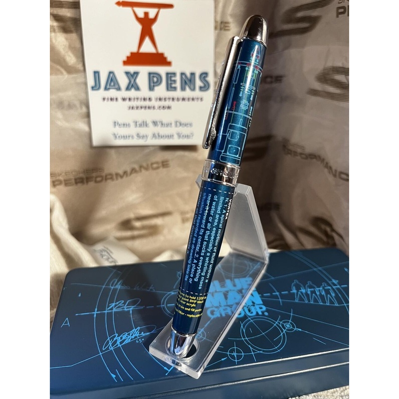 The Blue Man Group proudly presents, in conjunction with ACME Studio, the “Vortex” Rollerball Pen. Originally released in August 2008, Background color of the barrel and end cap is, what else but, blue. About the surface is an image of a vortex is gold with lighter blue, red, and green lines and boxes. ‘Blue Man Group’ is emblazed in one of these boxes. The finials and centre band are chrome. This pens’ release was limited to a cool 1000 pieces so this is a RARE find.