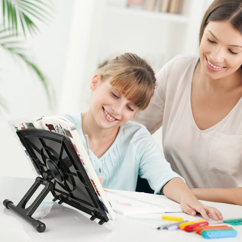 Adjustable Book/Copy HolderThis Book/Copy Holder features a unique swivel stand assembly that can change the unit from portrait to landscape in seconds. When used for books, the adjustable clips keep the book opened to the desired page. For copy, clips on the copy holder platform hold sheets in place. When not in use, units folds flat for convenient storage. Made from durable polystyrene for years of use.