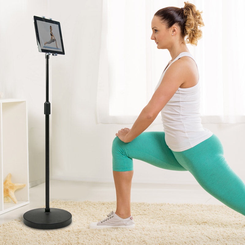 Adjustable-Height Universal Floor Stand Tablet HolderThe Universal Floor Stand Tablet Holder has many applications. The spring-loaded “hands” securely hold tablet computers from 7″-13″. The patented swivel assembly allows tablet to rotate a full 360, and adjust in tilt from 0-90 for optimum viewing. The weighted base keeps the unit firmly in place. The telescoping post adjusts in height from 33″ for deskside use to 55″ for standing use, making it ideal for use in reception areas, store fronts, and tradeshows, as well as for use in meetings, presentations, and seminars. Also available is the Adjustable-Height Universal Floor Stand Tablet Holder w/ Extension Arm. This unit has all of the same features, but adds a 14″ long, L-shaped extension arm, making it perfect for use next to your bed or favorite chair. Telescoping post adjusts in height from 26″-43″.