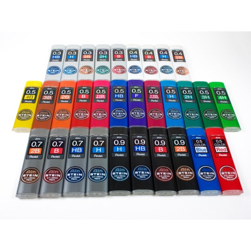 Pentel's Ain Stein lead is made to be stronger and less susceptible to breakage than traditional mechanical pencil lead. Available in .2, .3, .4, .5, .7, and .9mm sizes and a variety of densities. Also available in .5mm Blue and Red colored lead. The cap i