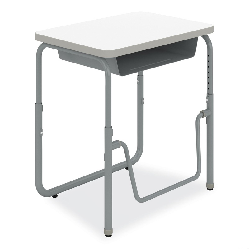 Encourage healthy movement and provide convenient storage with the AlphaBetter 2.0 height-adjustable student desk that features a high-pressure laminate top and under-surface book box. This desk comfortably accommodates students of all sizes as they work or sketch ideas. A pendulum footrest allows students to redirect excess energy and continue to move, even as they sit, providing ergonomic support, increasing comfort, and promoting cardiovascular health. Great for boosting productivity and focus, this student desk has the added benefit of optional casters for better mobility throughout the classroom, and a convenient book cubby right beneath the desktop. Height adjusts accommodating students in 5th grade and up as well as adults at seated and standing heights. Series Name: Safco AlphaBetter 2.0; Worksurface/Base Color: Dry Erase; Color Family: White; Worksurface Shape: Rectangular.