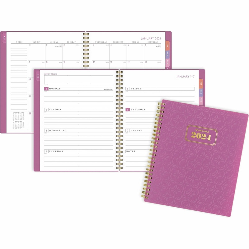 Organize your schedule with this Badge Weekly/Monthly Planner. This thoughtful organizational tool puts you at the control center of your life to tackle each day. High-quality paper with superior ink bleed-resistance stands up to even your boldest pens. Plan, set and achieve goals and track important notes. Planning pages range 13 months from January to January and include weekly and monthly spreads with count of days/days remaining. Durable, flexible poly cover in geometric purple design maintains its shape even after being bent or curled. Double-sided poly pocket stores loose sheets. Twin-wire binding prevents snags and helps the planner stay flat when open for easier writing. Special pages include a holiday list, seven contacts pages, six notes pages, a three-year reference calendar and event calendar.