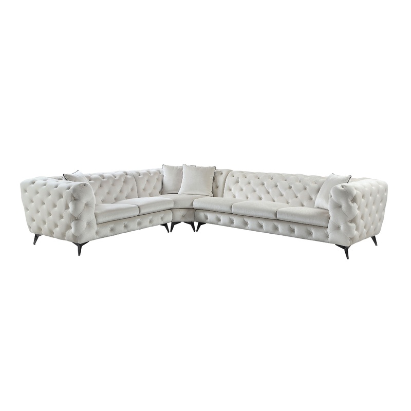 - Construction Details: This sectional features pocket coil seating with KD legs, a wooden inner frame, and metal legs. It includes accent pillows, a tight back, and a loose seat cushion with button tufting for added style.