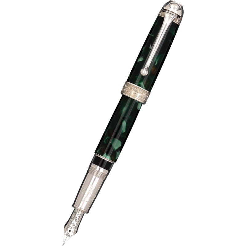 Fountain pen with 18kt. solid gold nib, rhodium-treated. Piston filling system. The cap and barrel are in marbled greenAuroloide. Beautiful sterling silver trims. All nib sizes available. EF, F, M, B, BB, Stub & Italic.