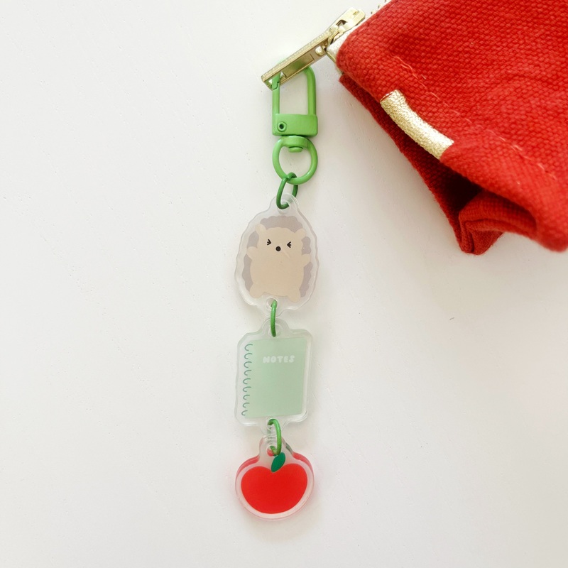 This keychain features a cute trio of three hedgehog themed icons: a hedgehog, notebook and red apple. Great for adding to your keyring or bag to make it fun! *This keychain may come with a protective film on both sides that can be easily removed. Details: