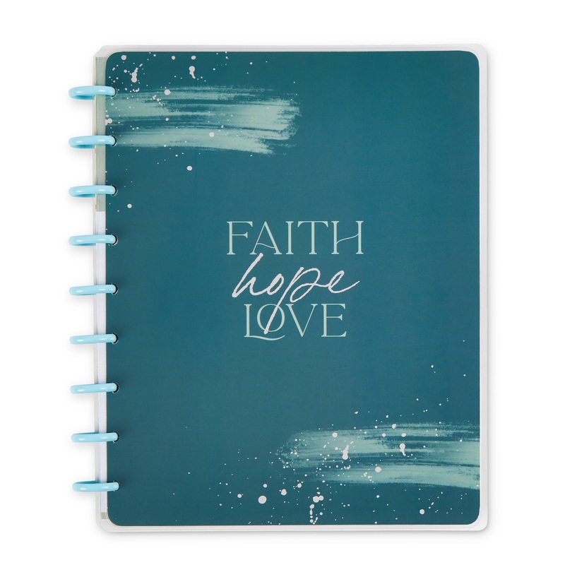 Faith, hope, love. This Classic size notebook includes 60 sheets with 3 dividers and sturdy laminated covers with mini Happy Planner discs. The Happy Planner disc bound system allows you to remove and insert dividers and pages easily. Use this notebook for