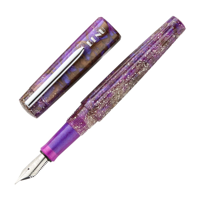 This BENU DailyMate fountain pen features a purple and brown resin base with silver glitter patches throughout. It has a silver Schmidt #6 stainless steel nib and a silver clip.