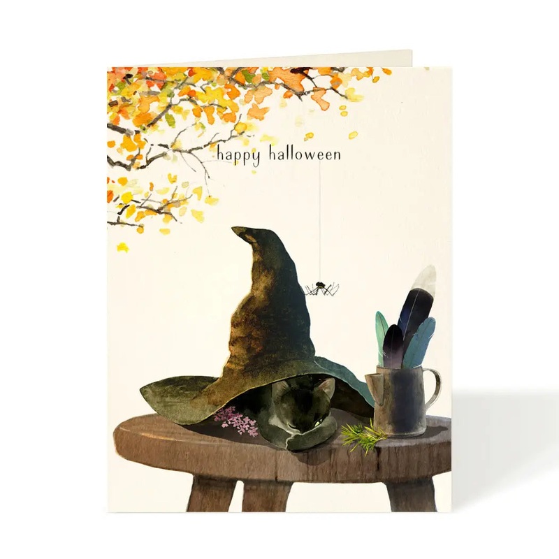Whose black cat is hiding under that witch's hat? What magic is being created with the feathers and flowers? A spider enters to view it all or maybe add its web to the concoction. The recipient finishes the story. Printed on a beautiful stock, this card fe