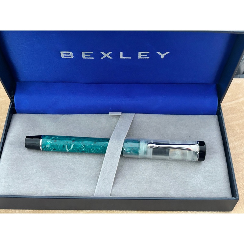 Likely a prototype, this Bexley Deluxe Green Jade features a striking translucent barrel paired with a clear demonstration cap that has minor internal marks (see photo). Its fitted with an elegant broad 18K two-tone gold nib and uses a cartridge/converter filling system. Offered in new condition, this fountain pen comes complete with its original box and paperwork.
