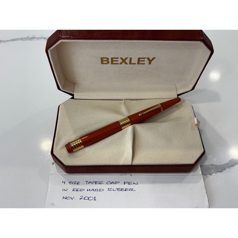 The Bexley Taper Cap in vibrant orange ebonite features gold trim and is fitted with a smooth 18K gold Stub (S) nib. Produced around 2001, this superb pen blends bold color with fine craftsmanship for an exceptional writing experience.