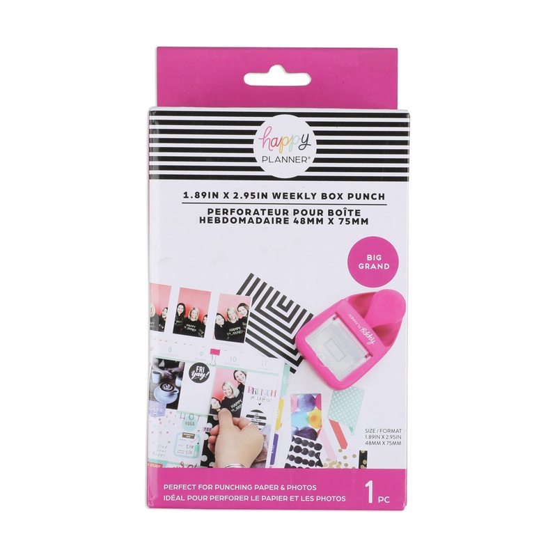 The BIGWeekly Box Punch is designed to fit perfectly within theBIG vertical planner’s columns. The BIGWeekly Box Punch cuts paper or cardstock to 1.89 in by 2.95 in (48 mm by 75 mm).Now you can punch your own paper and photos to add to your Happy Memory Keeping planner or Happy Planner. Anytime is the perfect time to start memory planning, so let theBIGWeekly Box Punch help you start TODAY!Punch capacity – 2 sheets of paper or 1 sheet of cardstock