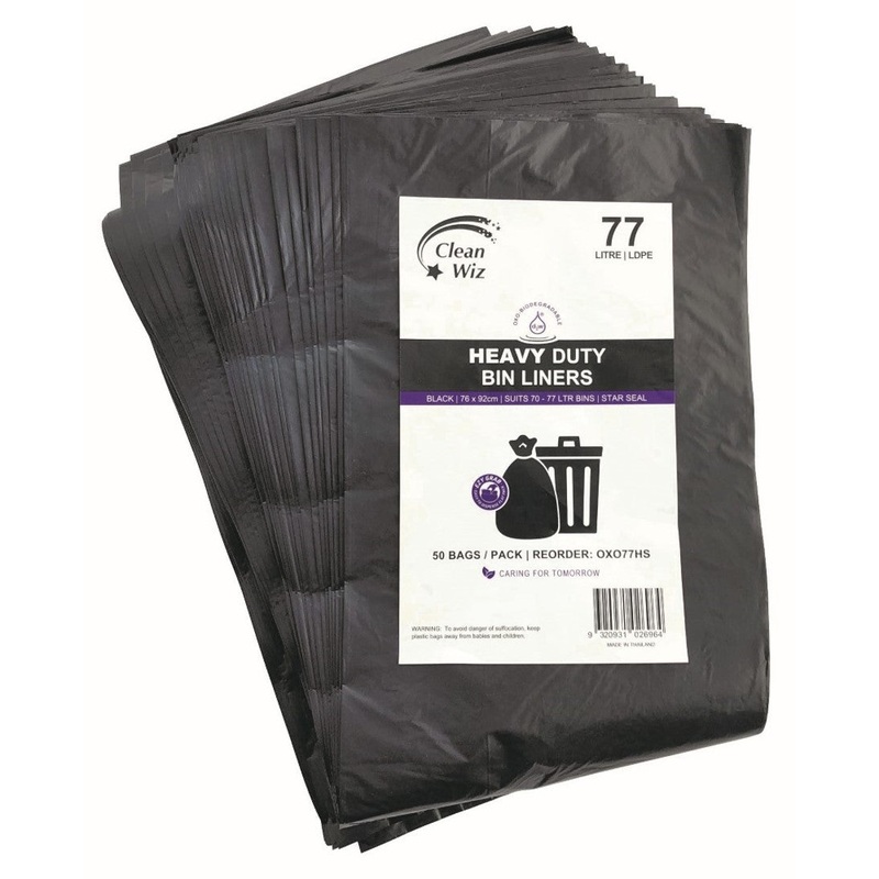 W1S175XXBIN LINER CLEAN WIZ 77L ECO OXO-BIODEGRADABLE HEAVY DUTY STAR SEAL BLK PK50 (MULTIPLE ORDER REQ 5) G84651
