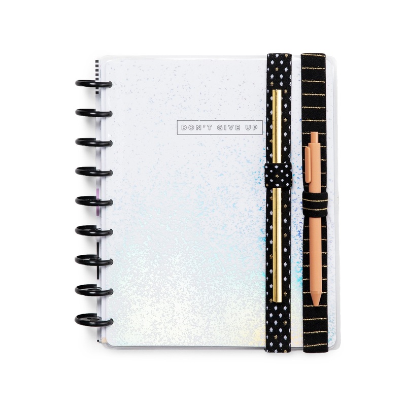 The handiest accessory you never knew you needed for your planner. Never forget or lose your pen again with the Black and Gold Elastic Band Pen Holders. Slip the stretchy band onto your Classic size Happy Planner, notebook, or journal. Gold lurex accents a