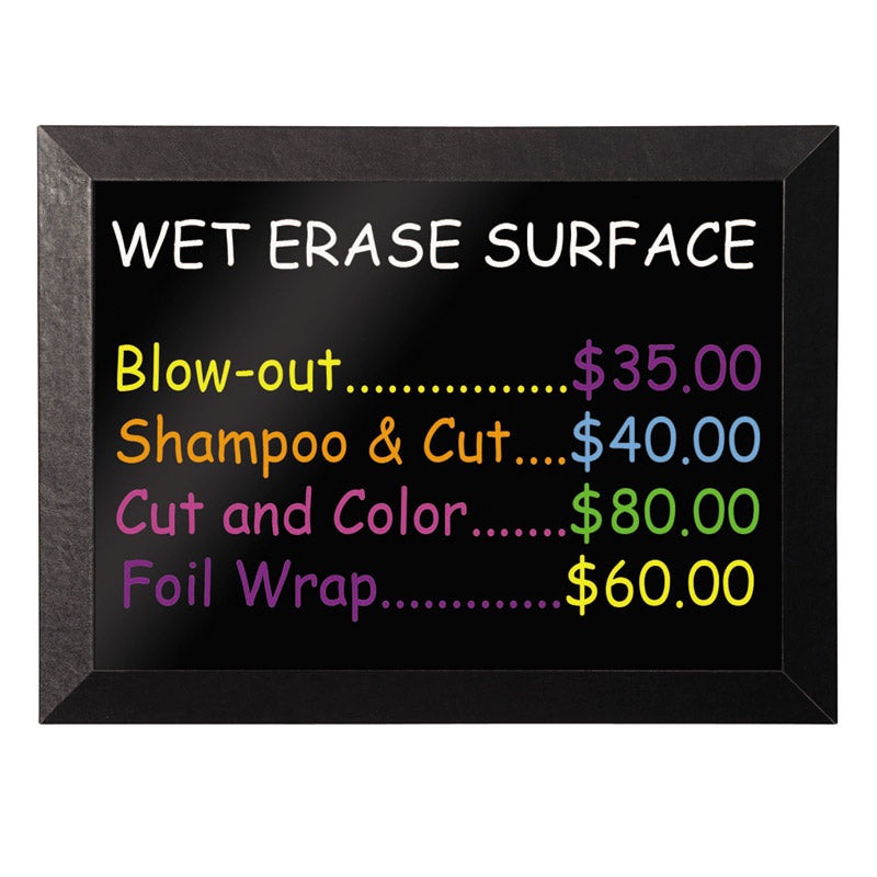 FeaturesBlack wet-erase surface allows writing to pop!For use with wet-erase pensDurable surface cleans with damp clothHandsome beveled wood frame is finished with a black linen textureAvailable in 2 sizesWall mount hardware includedDetailsThese Black Wet
