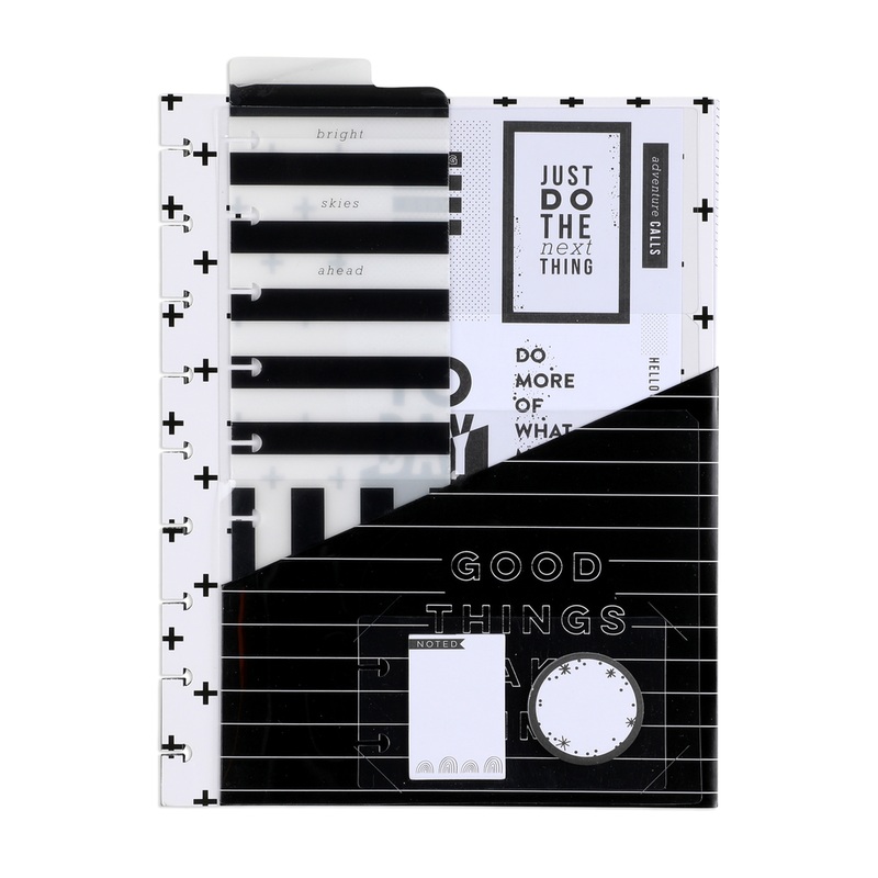 Designed with minimalist styling, this accessory pack features simple designs and black and white patterns. It includes a snap-in folder, stickers, sticky notes, a bookmark, and filler paper. Add these into your Classic size Happy Planner, notebook, or journal to bring more utility to everyday planning.