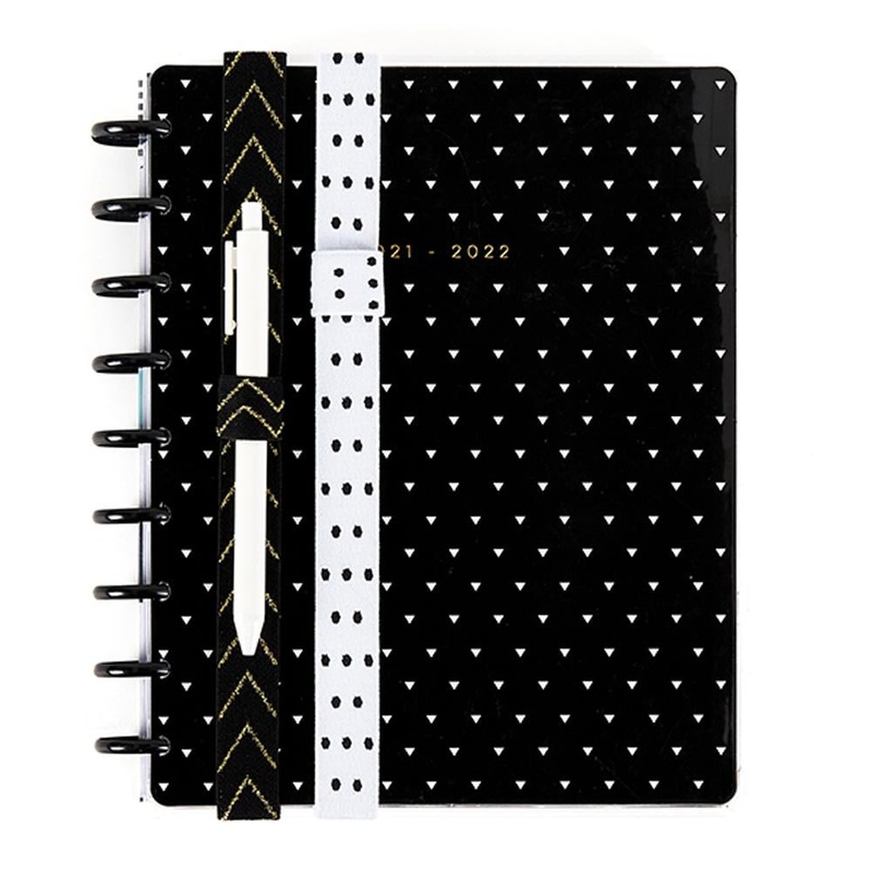 Never forget or lose your pen again with the Black and White Elastic Band Pen Holders. Slip the stretchy band onto your Classic size Happy Planner, notebook, or journal. Gold lurex accents at the chevron patterns and polka dot prints with secure pen loops.
