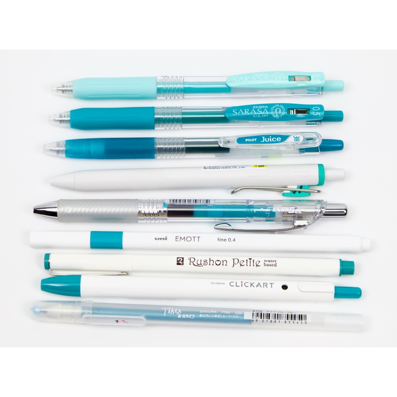 9 of our favorite blue green / turquoise pens, with a savings of 10% on the bundle. This set is meant for those that would like to try a bundle of different Japanese all time best selling pens.Set includes:Pilot Juice in .38mm Turquoise Green. Uniball One