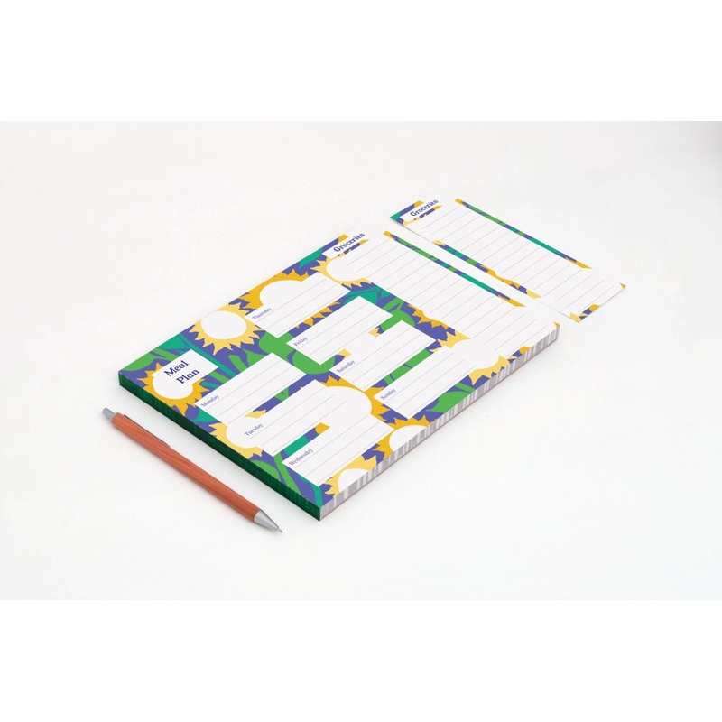 Studio Wald's week planner contains 52 pages which will give one year of organised weeks. Made using 100% recycled paper and hand glued with yellow pigment. Background pattern developed from Wald's bank of linocut patterns. // Size: 21 x 14.8cm (A5) // 115