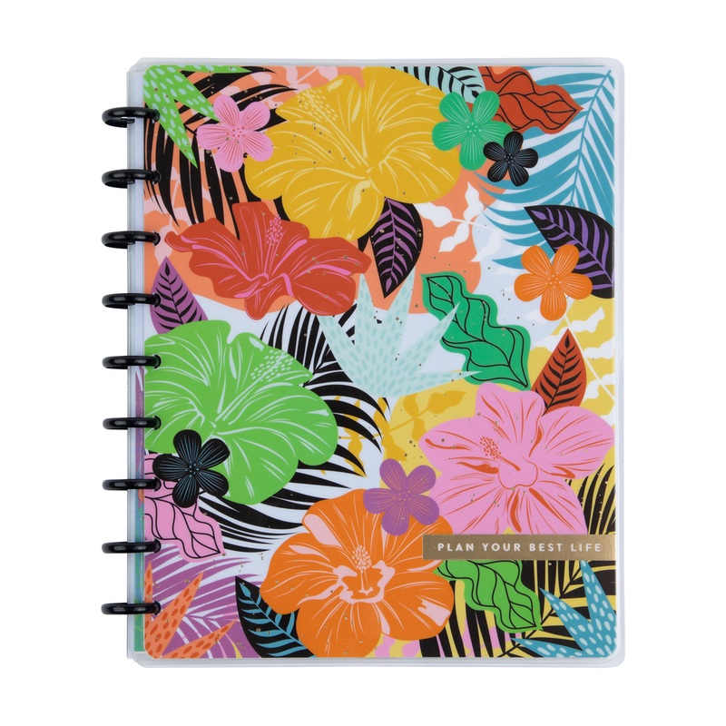 Focus on the bright side of life with our tropical theme notebook. Document and keep track of all your daily to-dos in this handy Happy Planner classic dotted-lined notebook. This Classic size notebook features palm fronds, pineapples, and a fun tropical f