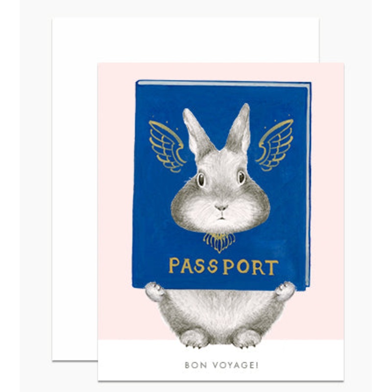 A graphite Bunny holding a hand-painted Passport text reads Bon VoyageSize A2 (4 " x 5 ")Printed on soft white paperPaired with a matching soft white envelopeBlankinside