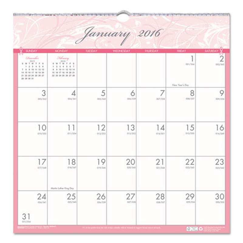 FeaturesHeighten awareness of breast cancer with this pink and gray calendar.Large unruled daily blocks.Wirebound with full chipboard back.DetailsHeighten awareness of breast cancer and show your support with this pink and gray wall calendar. Large unruled