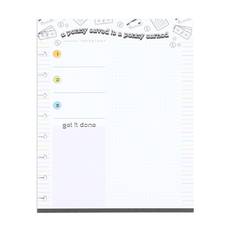Keep track of your weekly expenses with this handy 100 sheet block pad! The notepad comes in the Classic size and you can easily add these pages into your Budget Happy Planner. Use it as a place to prioritize your spending and write additional notes.100 sh