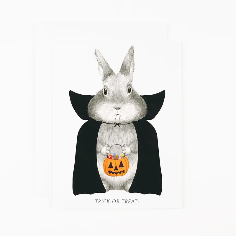 A hand drawn bunny in a dracula halloween costume holding a bucket full of candy with text that reads "Trick or treat".Size A2 (4 " x 5 ")blank insidePrinted on soft white paper and paired with a matching soft white envelope.