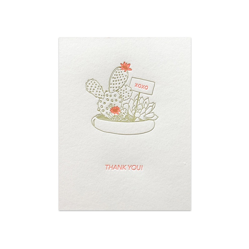 cactus bowl with a sweet "Thank You" message.Size: 4.25" x 5.5".blank insideletterpress printed on Crane's lovely cotton Lettra paper.pink/orange ink is actually neon...which is hard to capture on "film".