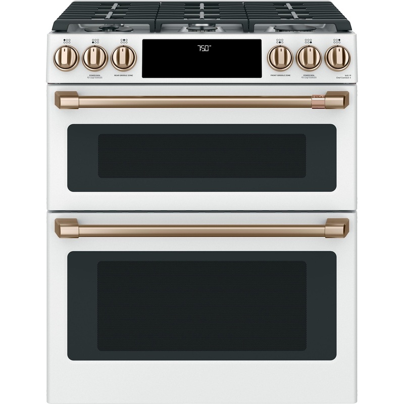 Caf(eback)(TM) 30″ Smart Slide-In, Front-Control, Gas Double-Oven Range with Convection – (CGS750P4MW2)