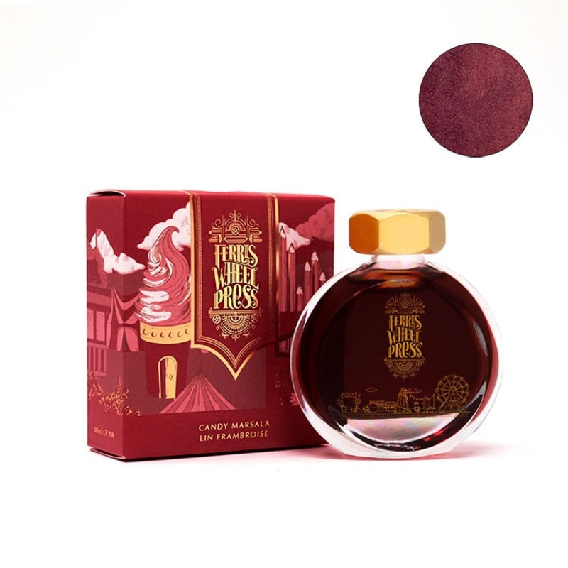 Candy Marsala is a premium bottled fountain pen ink, presented in a distinctive 38ml round glass bottle topped with a signature hexagonal brass nut. Each bottle is housed in a soft velvet travel pouch, adding a touch of luxury while protecting the ink from light and dust on your desk or shelf.
