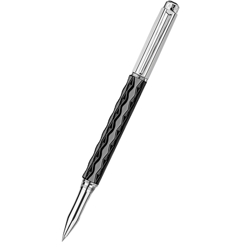 The Caran d' Ache Varius Ceramic Black Rollerball Pen. The deep black elegantly blends with silver-plated and rhodium coated finish.The pen features silky touch, interplay of light and the union of materials which combines to produce a technical material a