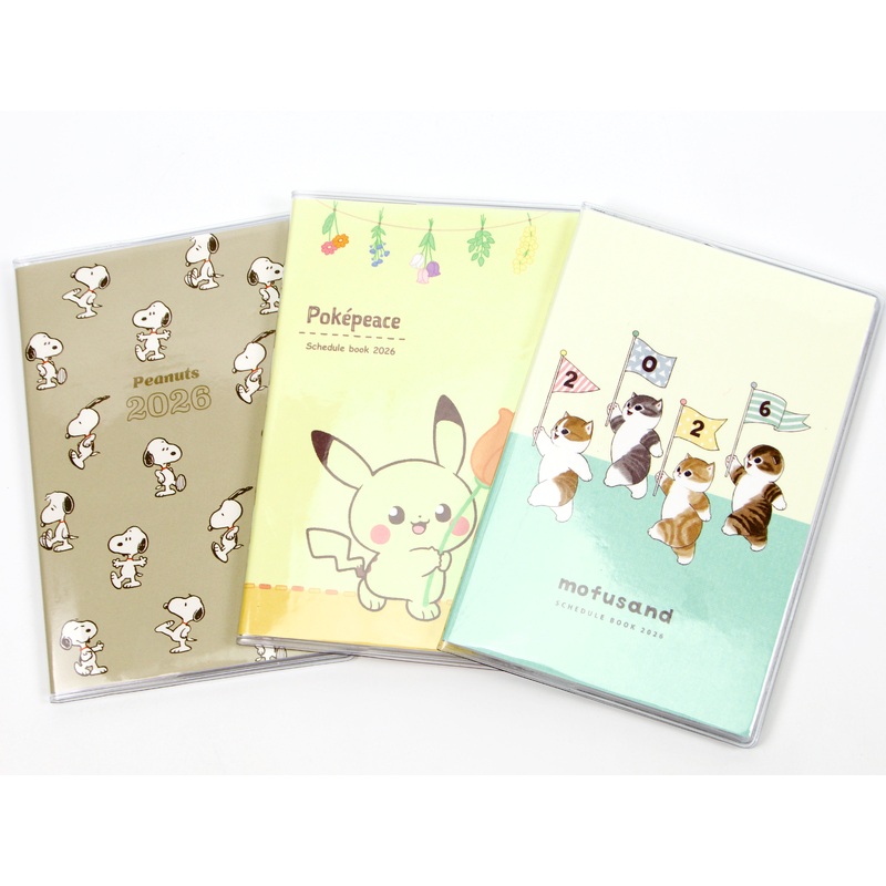 A perfect passport size (B7) monthly schedule book featuring your choice of Mofusand, Snoopy, or Pikachu. These 2026 character schedule books start with October 2025 and end December of 2026. In addition to the month-on-two-page spread, they include cute f